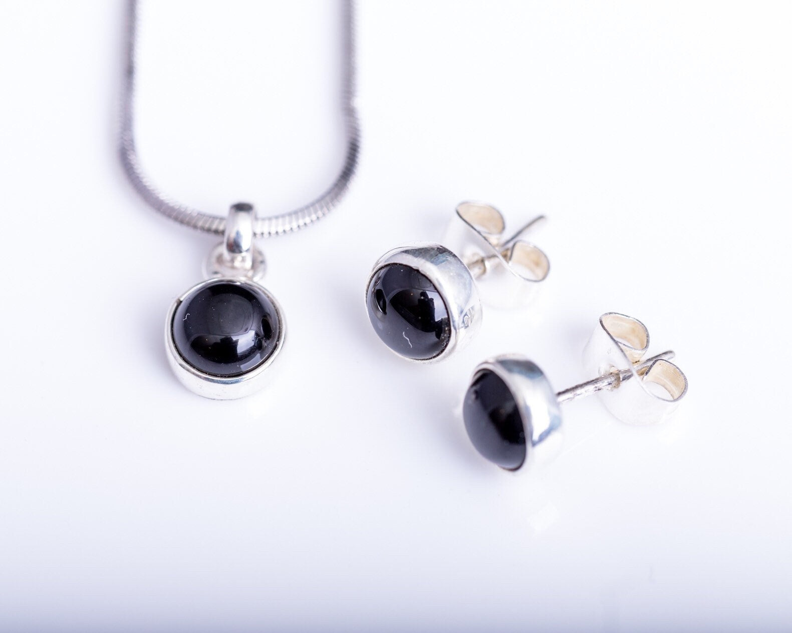 Black onyx stud earrings and necklace set, Sterling silver round studs, men, children, and women,
