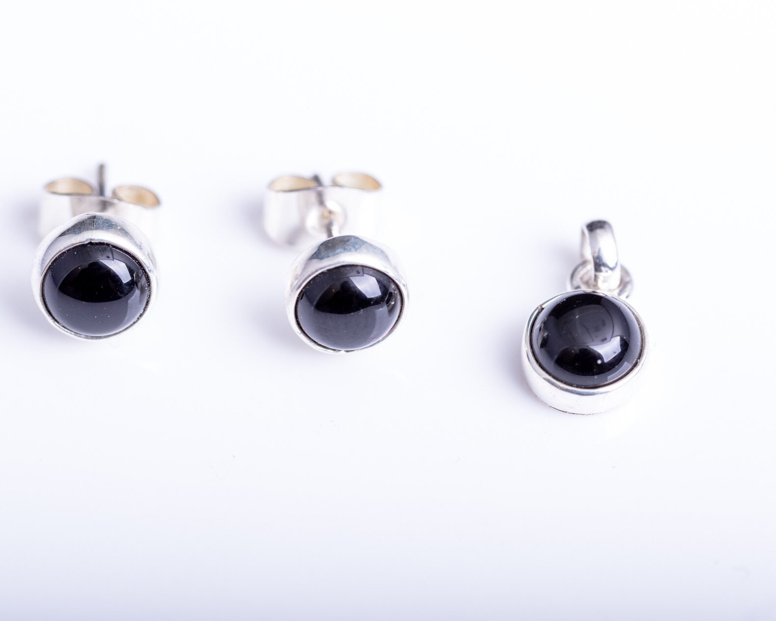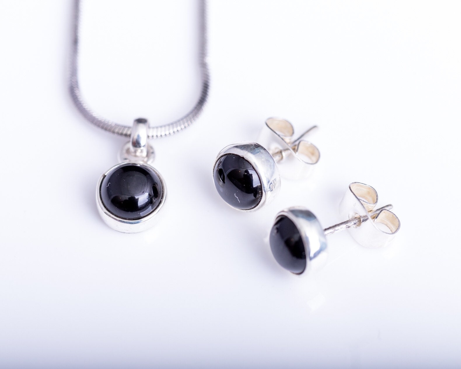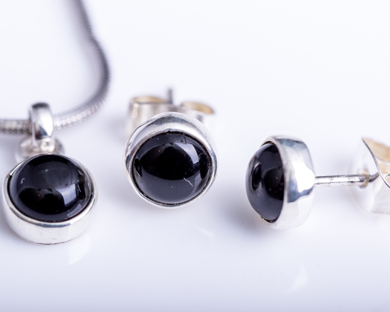 Black onyx stud earrings and necklace set, Sterling silver round studs, men, children, and women, gift for goth