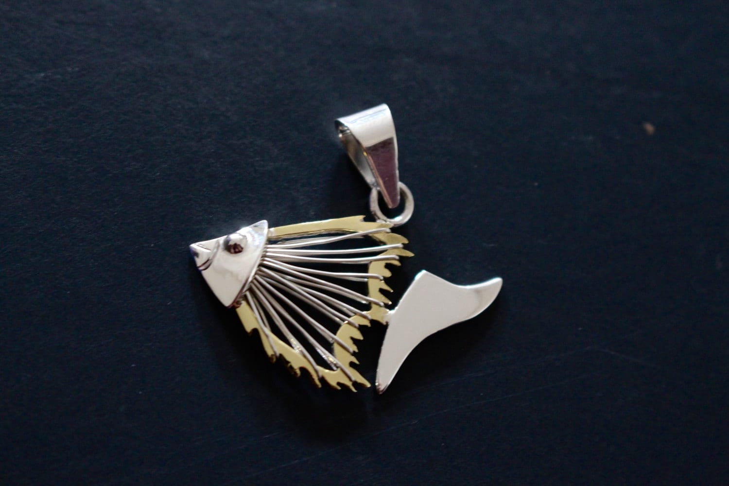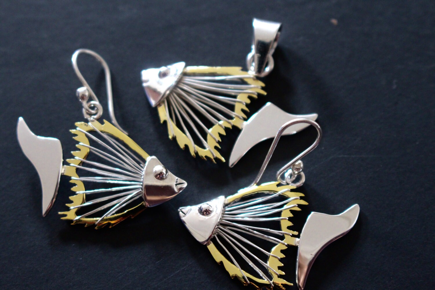 Fish jewelry Necklace silver angel fish unisex signed pendant matching earrings available two tone silver & Gold Fish Skeleton Bones-