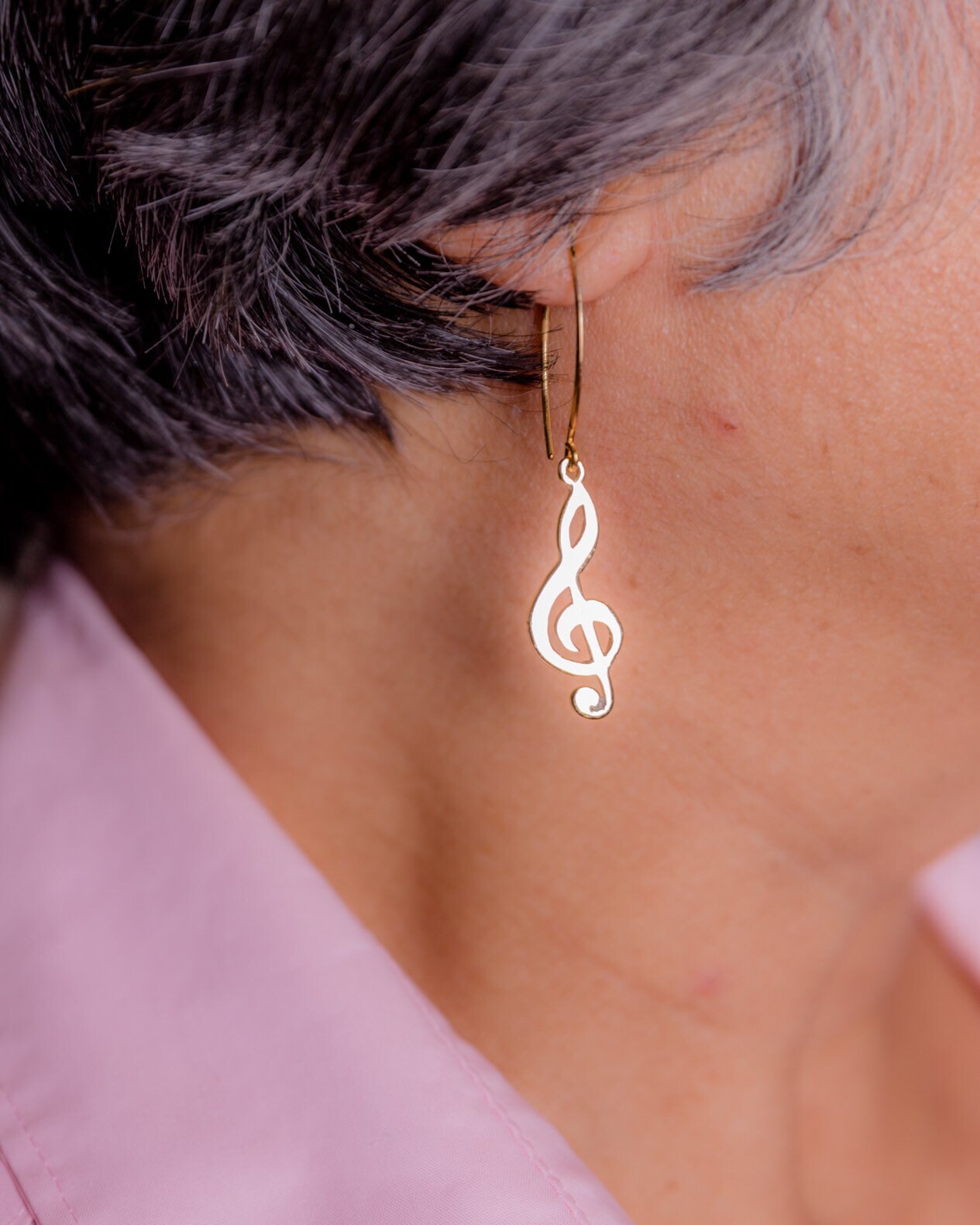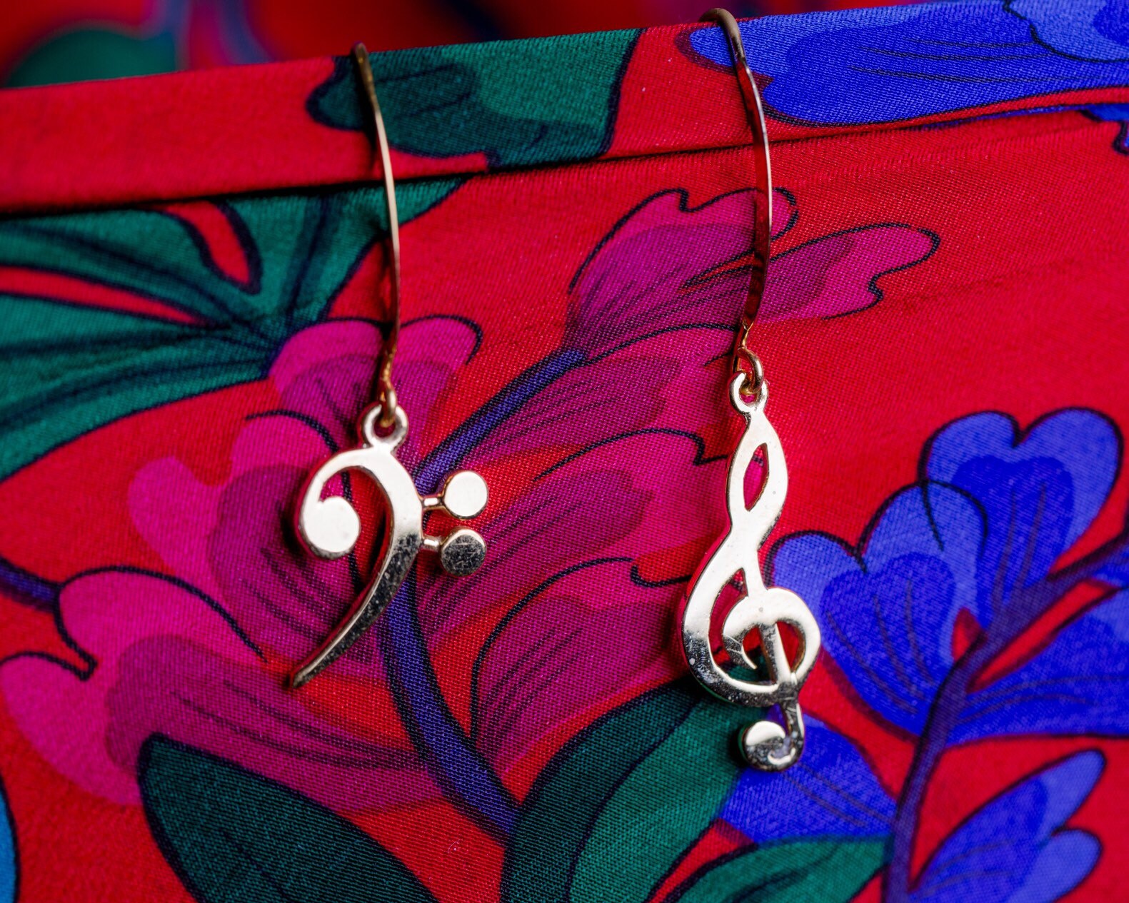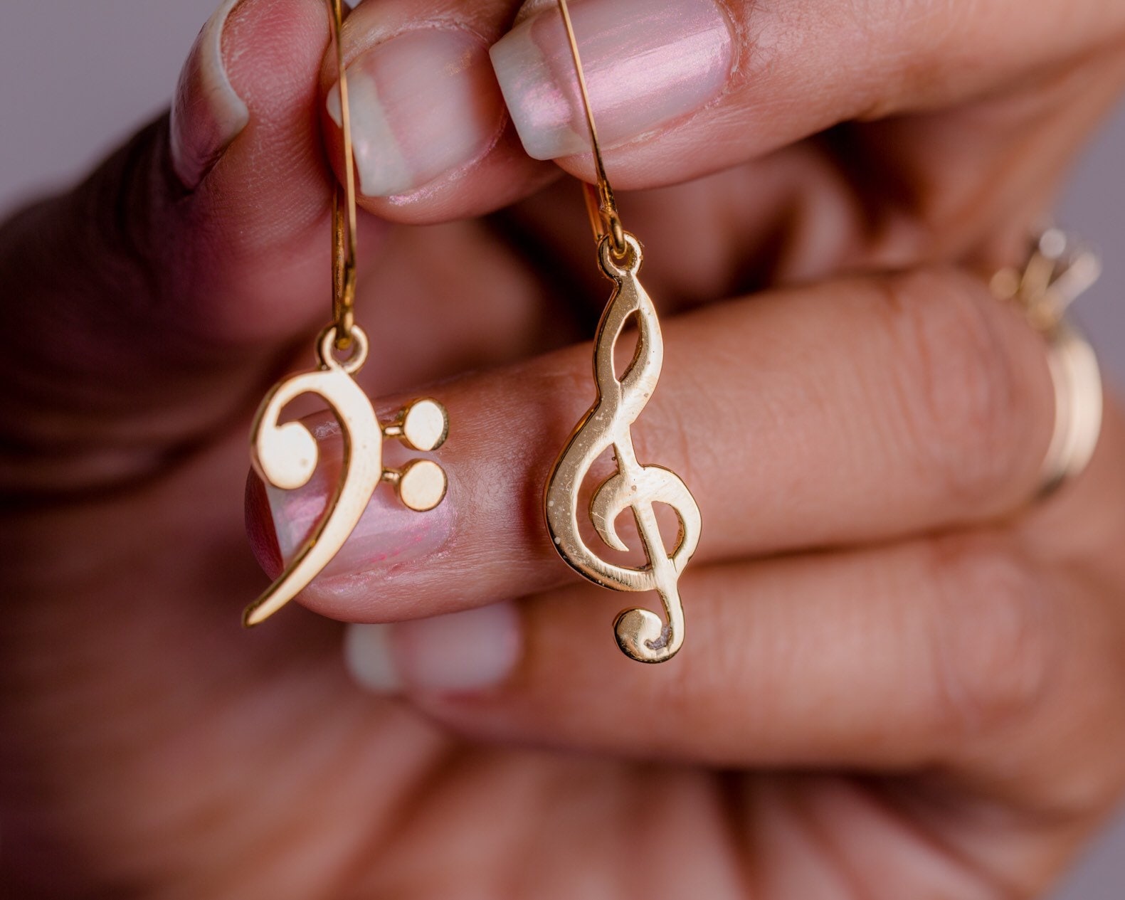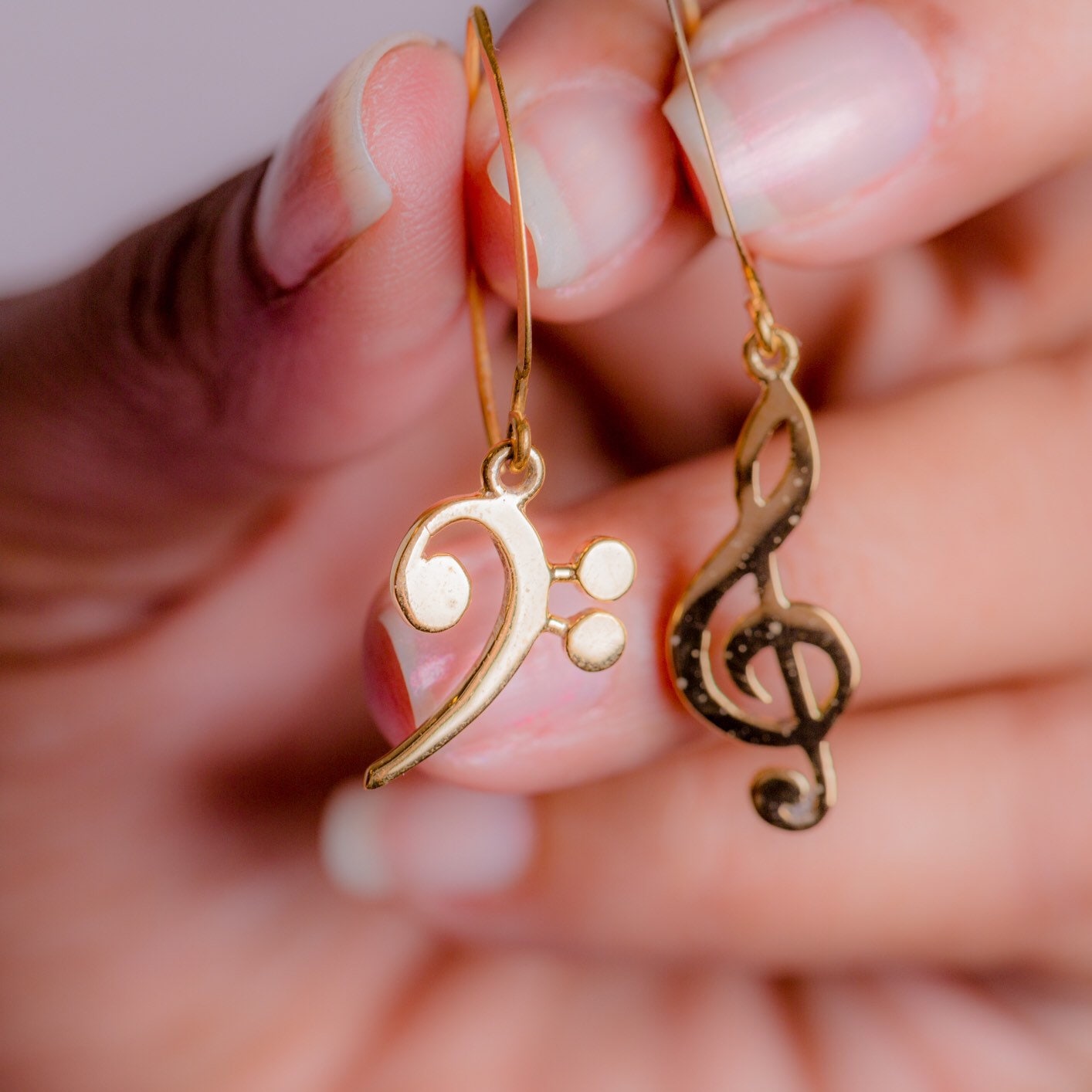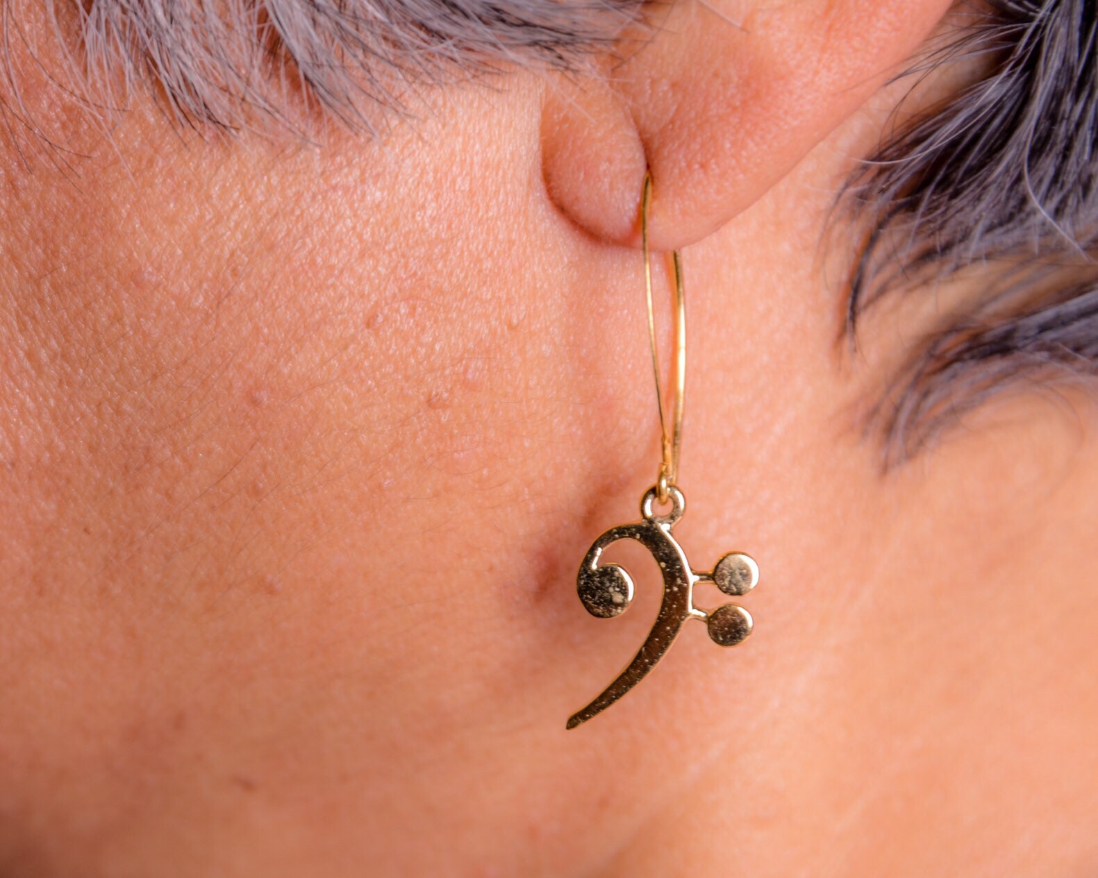 Gold Music drop earrings, Treble and Bass Clef in opposite ears, handmade Chester Allen's unique music jewelry art