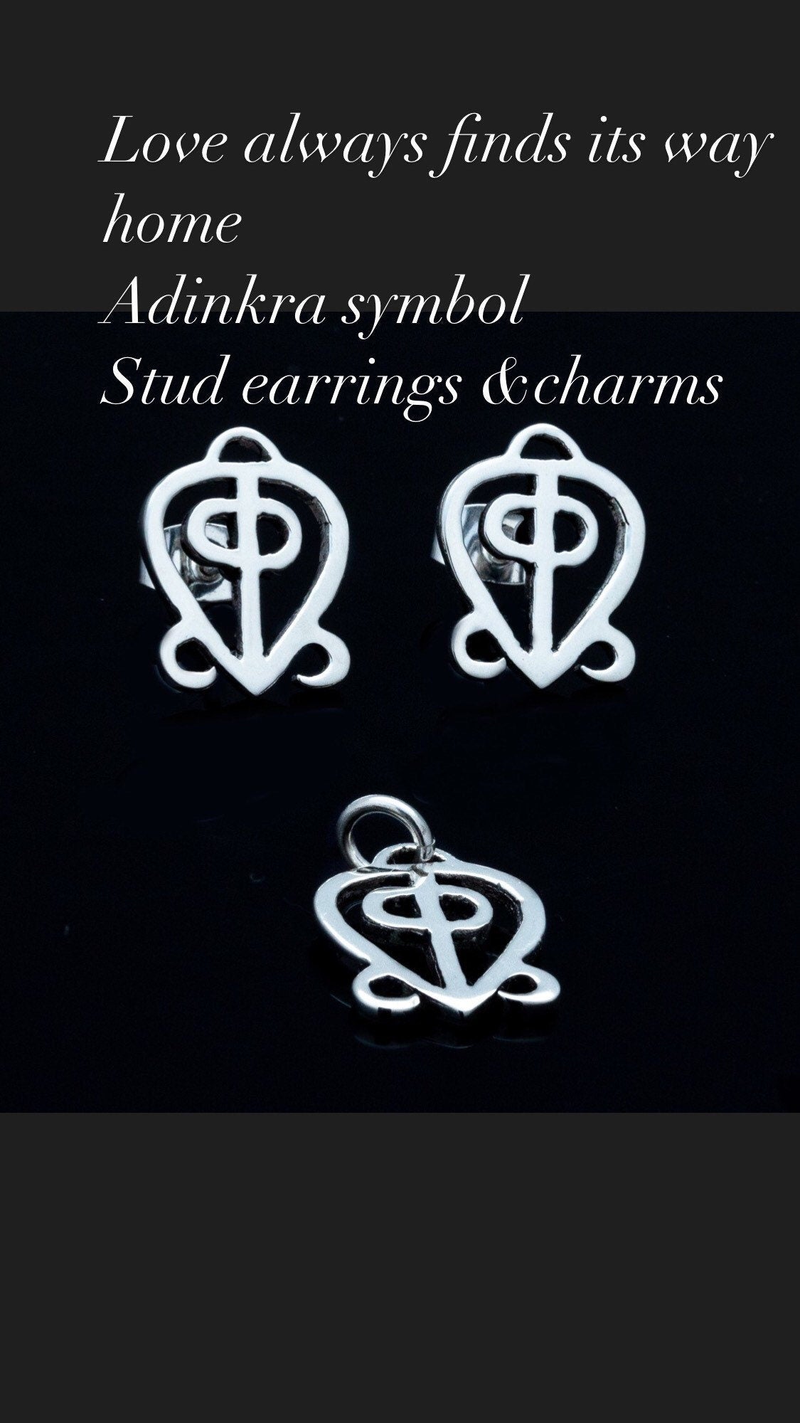 Adinkra Odo Nnyew Fie Kwan, Adinkra Love charm and stud earring set available in sterling silver jewelry