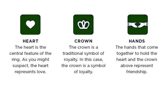 A Claddagh ring comprises three symbolic elements, and each has its own meaning – A crowned heart held by two hands - Symbolically, the heart represents love, the crown denotes loyalty, and the hands are a sign of friendship.