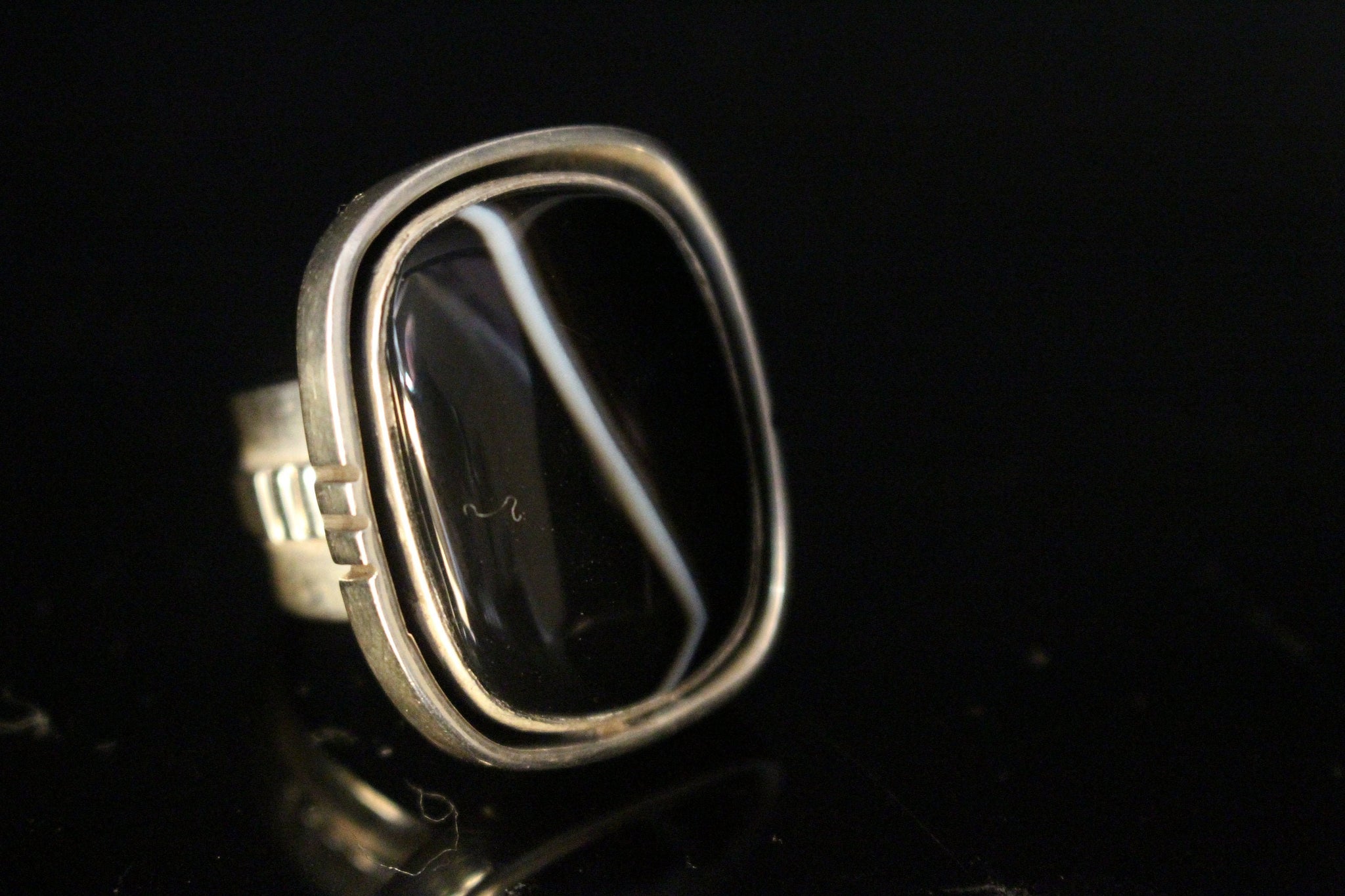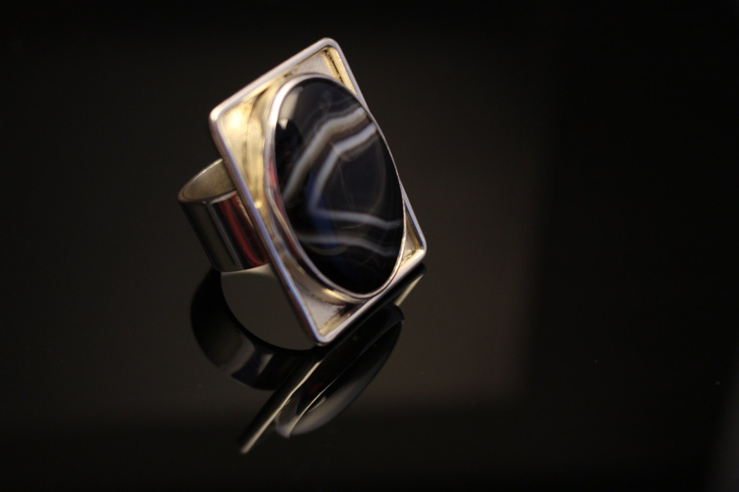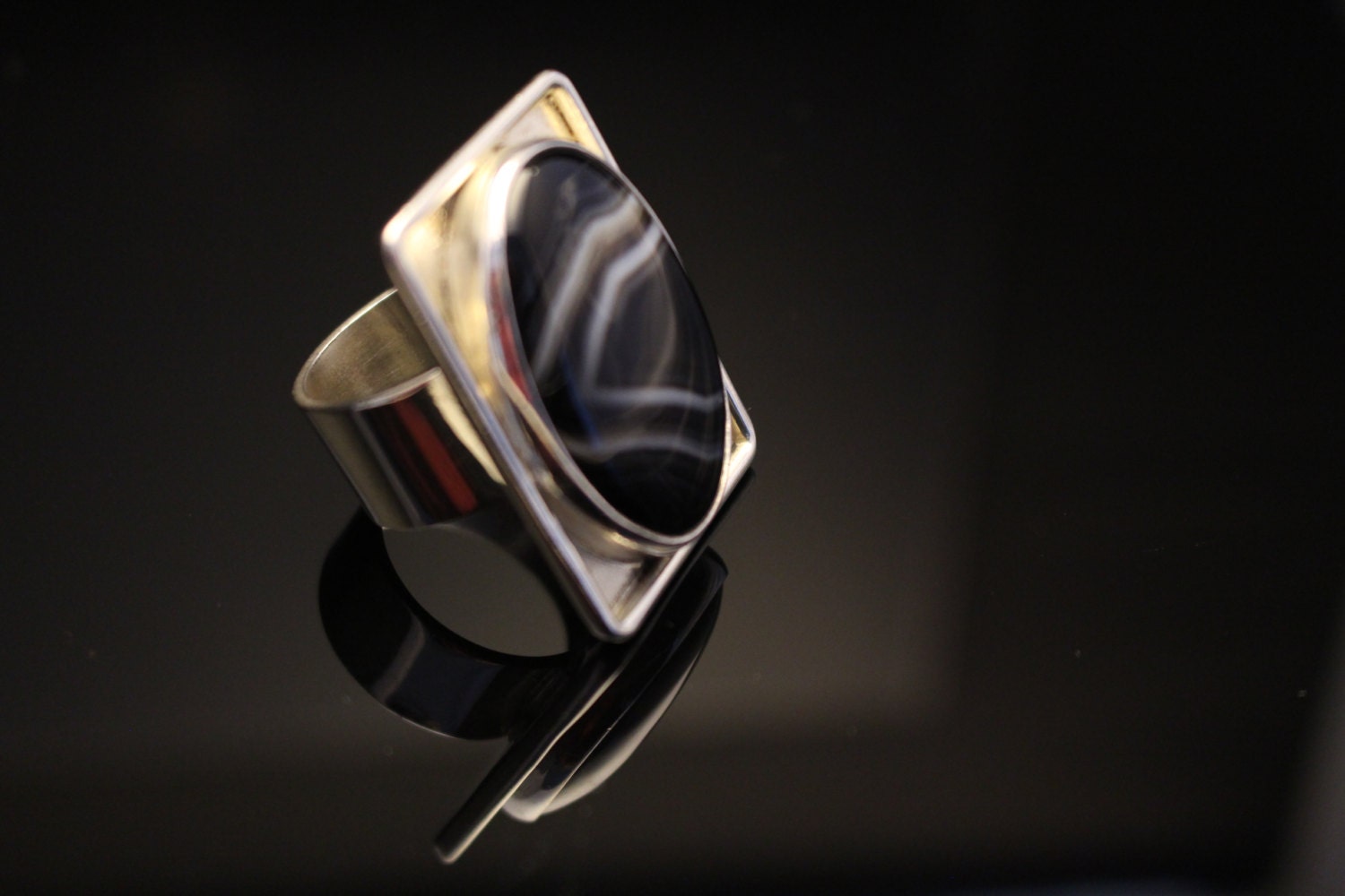Silver Ring Black Stone Sardonyx August Birthstone Square outer shadowbox Stone of Strength Protection