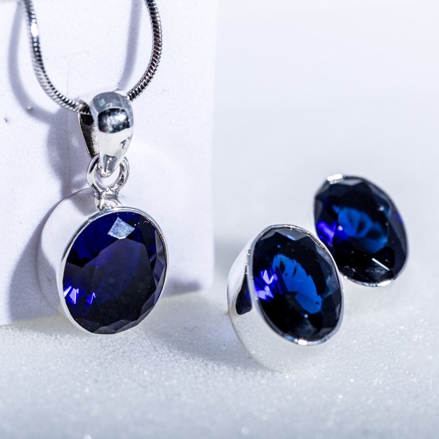 Silver sapphire jewelry set, September birthstone, 45th anniversary gift, Blue earrings and necklace set, lab-created sapphire zirconia set