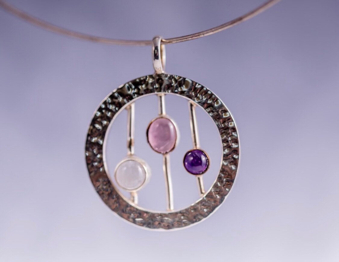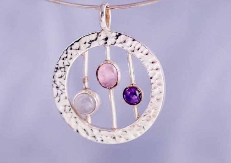 Moonstone Amethyst and rose quartz harmonically set in hammered circular thick sterling silver.