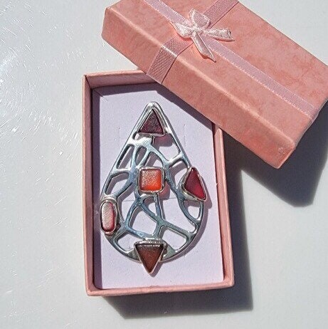 Unique Sea glass necklace, Mothers Day Gift, Handmade Silver pendant teardrop shape with red, orange and yellow beach glass, gift for her