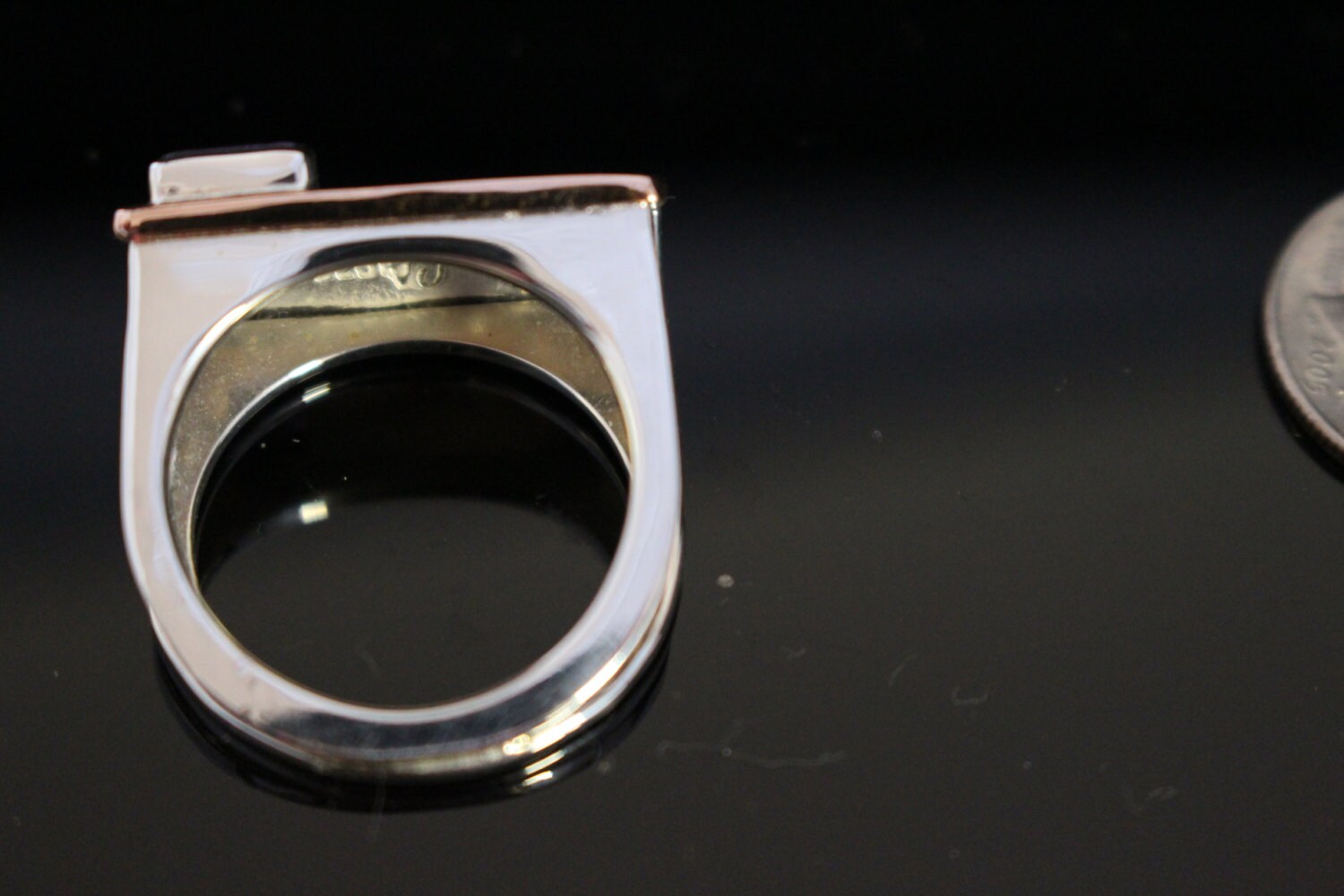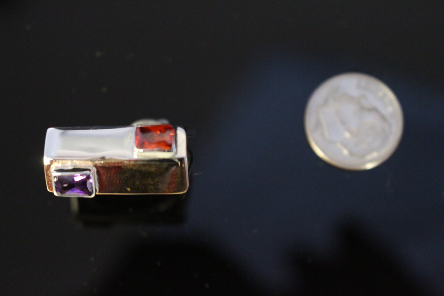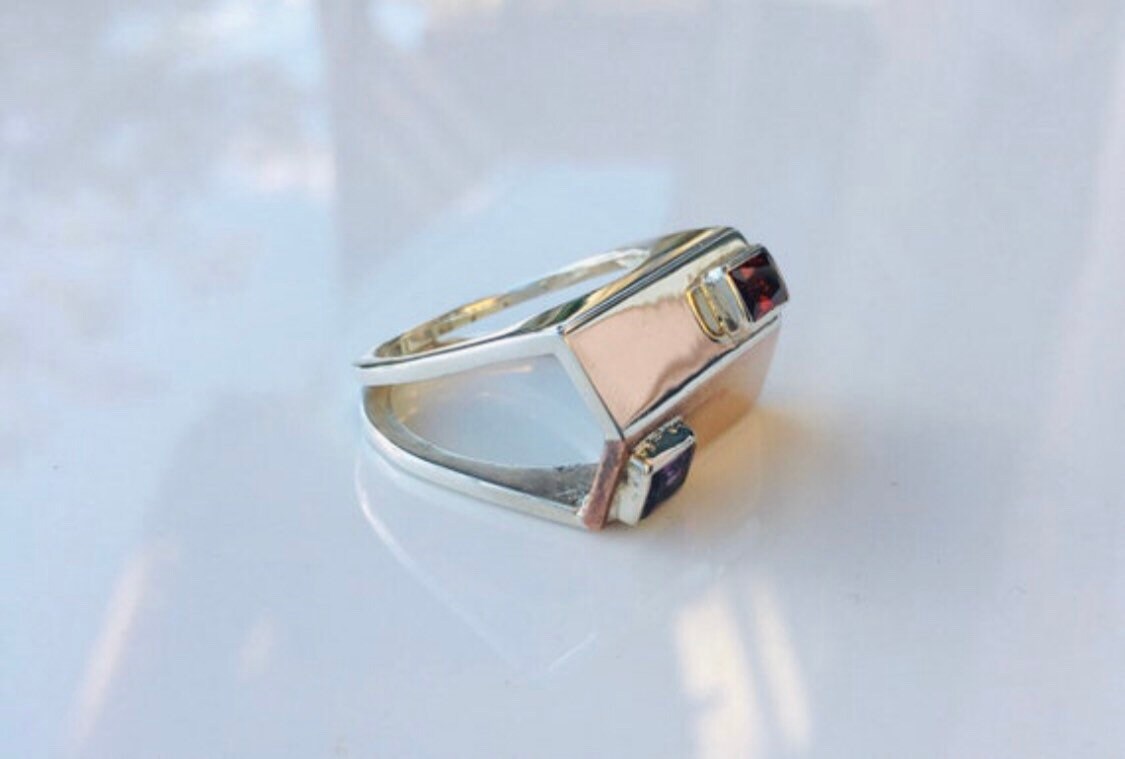 Unique two tone ring, Dual gemstone, amethyst, garnet stones, avant garde, east west horizontal ring design, relationship jewelry gift